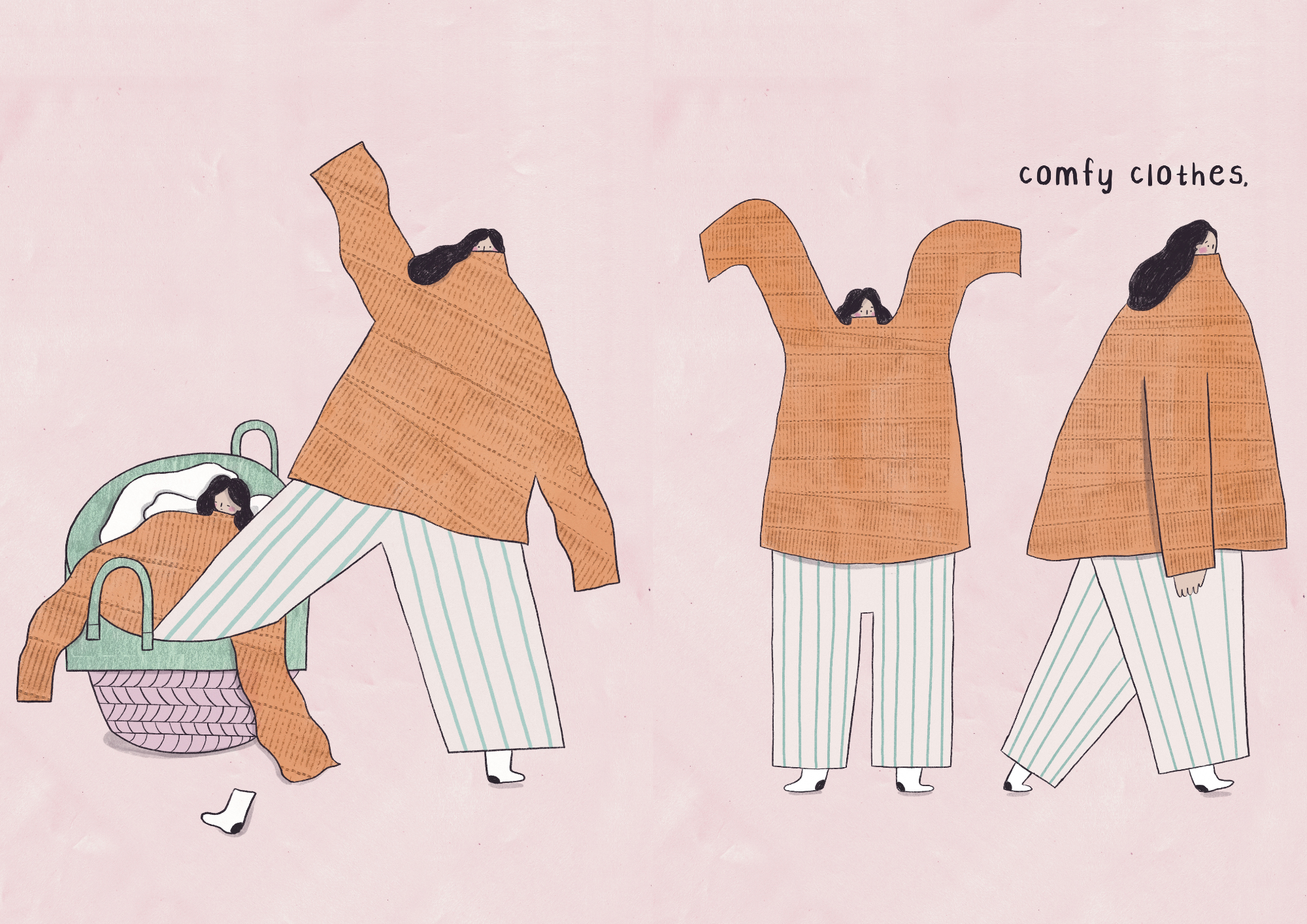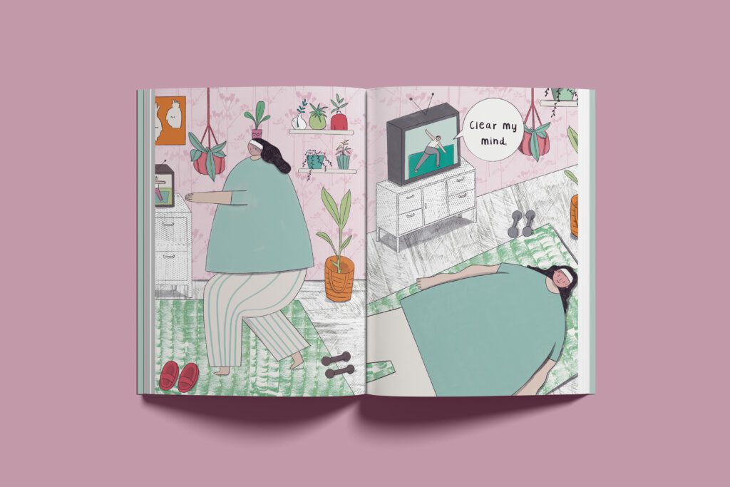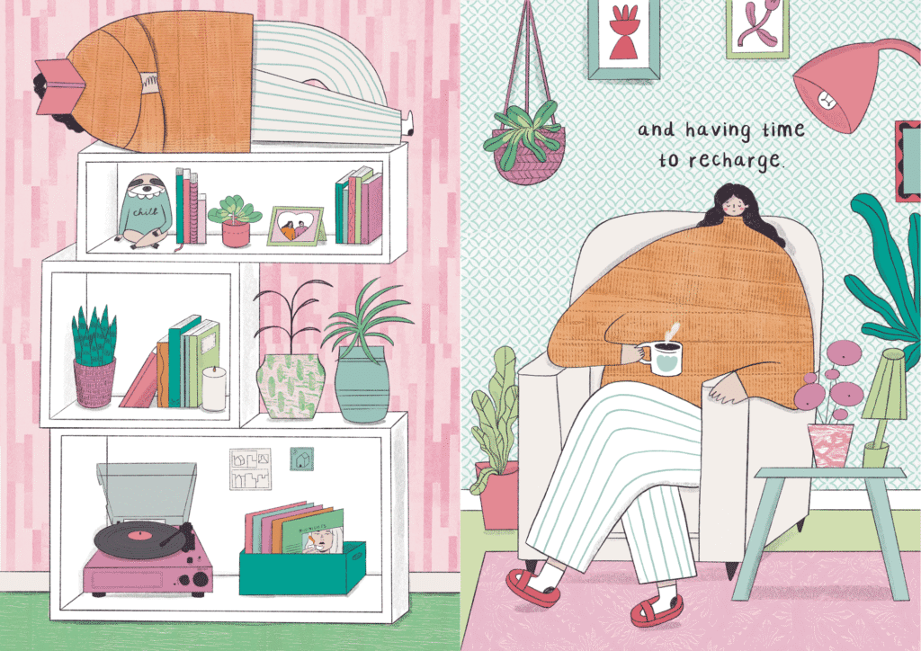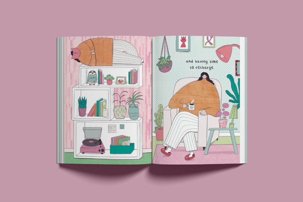 Homebody is a picture book in which discusses the importance of taking mental health days. The book covers a series of activities one could do when taking a mental health day. Using a simple yet playful take, collaged with traditional textures adds a sense of homeliness and comfort.